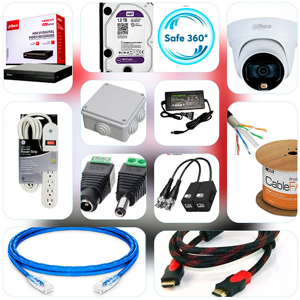 1 Grabador XVR de 8Ch | 1 Disco duro 1 TB | 4 Cámaras full color | Micrófono incorporado | 4 Video balun | 4 Fuentes de poder 12v | 4 Plug DC macho | 4 Plug DC hembra | 4 Cajas plexo | 60 metros de cable UTP | 1 Regleta eléctrica | 1 Cable de red 1.5M | 1 Cable HDMI 1.5M